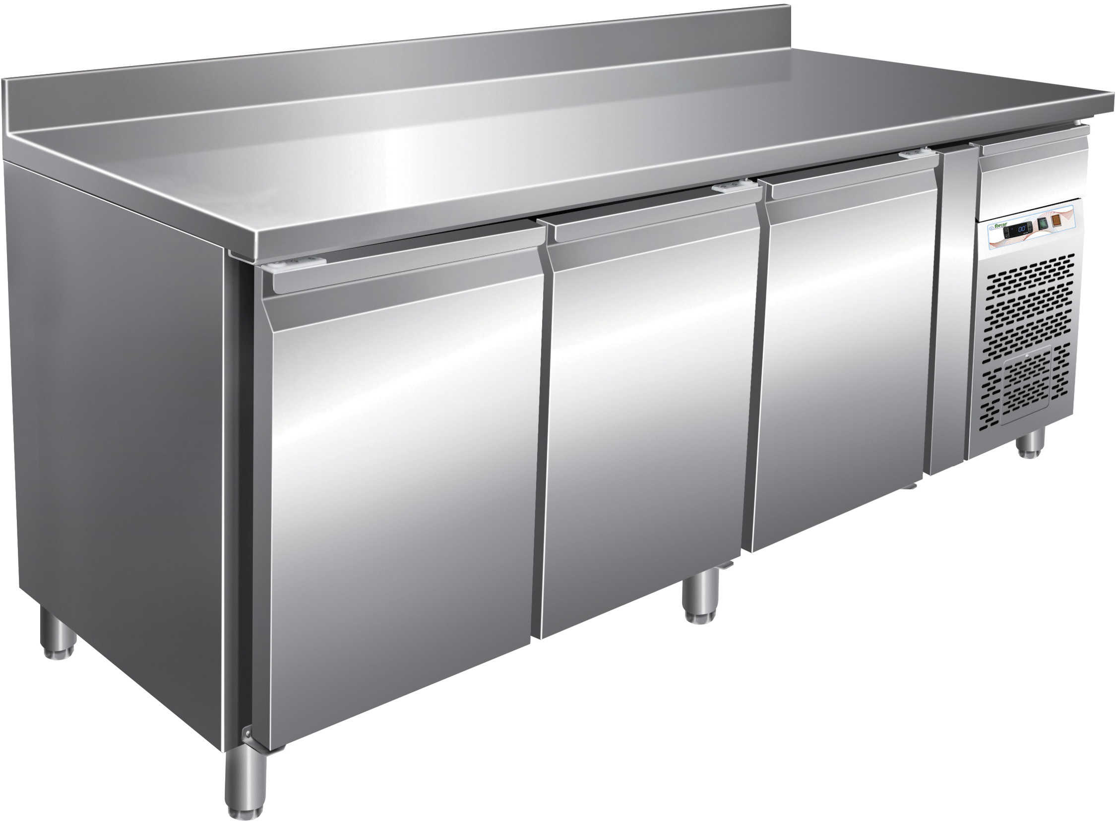 Tavolo refrigerato pasticceria con struttura in acciaio inox AISI 304. Refrigerazione ventilata. Pannello di controllo elettronico con display digitale. Sbrinamento ed evaporazione dell'acqua di sbrinamento automatici. Unità di condensa estraibile. Porta reversibile con guarnizioni magnetiche. Angoli interni arrotondati. Piedi regolabili in acciaio inox AISI 304. Porta con molla di ritorno. Schienale in acciaio inox possibilità di appoggiare al muro.