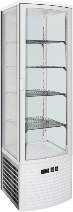Vetrinetta espositiva verniciata dotata di refrigerazione ventilata, sbrinamento a sosta, luce interna a led e controllo della temperatura elettronico. I quattro lati espositivi con vetri camera offrono una panoramica di tutti i prodotti mantenendo l'efficienza termica.