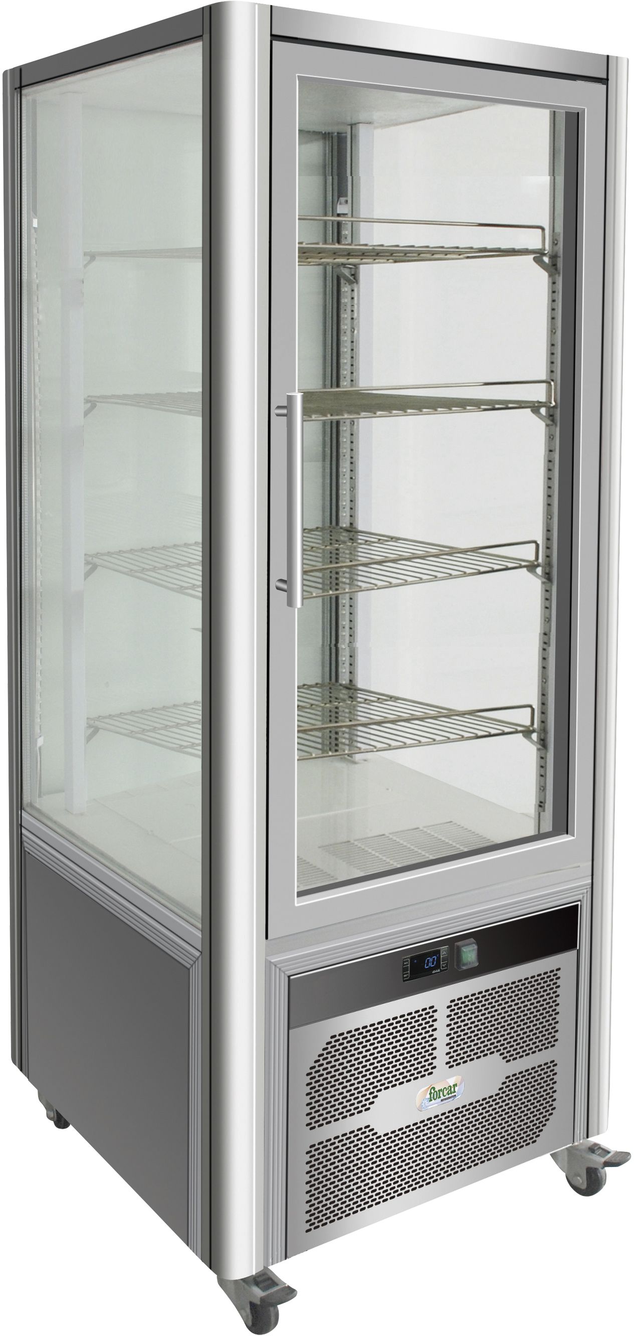 Vetrinetta espositiva refrigerata ventilata con struttura in vetro e acciaio inox. E' dotata di sbrinamento automatico con vaschetta per evaporazione acqua, luce interna a led e controllo della temperatura elettronico. I quattro lati espositivi con vetri camera offrono una panoramica di tutti i prodotti mantenendo l'efficienza termica.