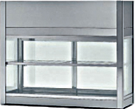 Vetrinetta refrigerata ventilata in acciaio inox dotata di sbrinamento temporizzato con vaschetta di raccolta condensa auto-evaporante, luce interna a LED e ante scorrevoli su guida posta nella parte alta della vetrina. I quattro lati espositivi offrono una panoramica di tutti i prodotti esposti pur mantenendo l'efficienza termica data dal vetro camera.