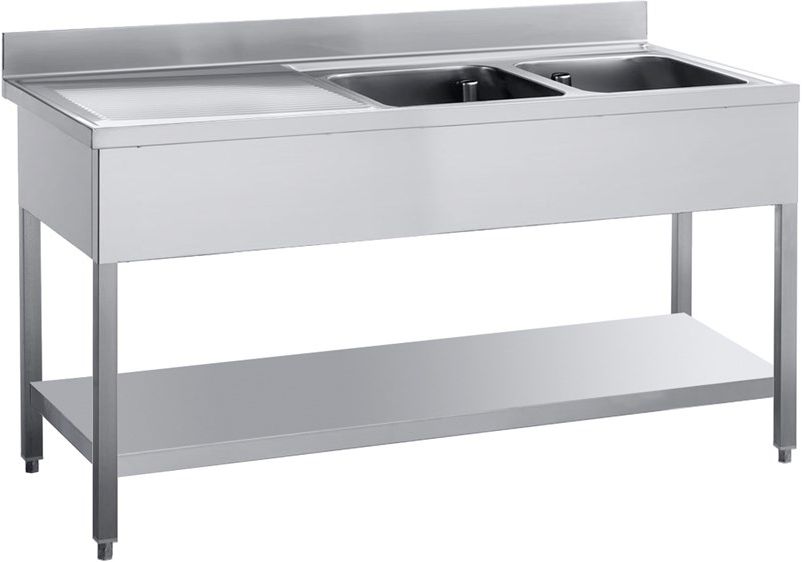 Lavatoio Inox Gambe Quadrate 2 Vasche Con Gocciolatoio a Sinistra 1600x700x850h