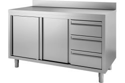 Tavolo armadiato professionale realizzato in acciaio Inox altamente stabile, dotato di piedini regolabili, ante battenti, cassettiera a destra e alzatina. Il nostro ufficio tecnico è disponibile a realizzare prodotti con dimensioni e forme diversi dalla nostra gamma.