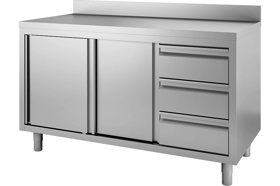 Tavolo armadiato professionale realizzato in acciaio Inox altamente stabile, dotato di piedini regolabili, ante battenti, cassettiera a destra e alzatina. Il nostro ufficio tecnico è disponibile a realizzare prodotti con dimensioni e forme diversi dalla nostra gamma.