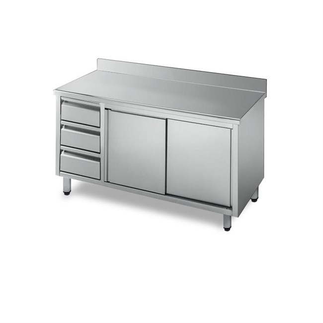 Tavolo armadiato professionale realizzato in acciaio Inox altamente stabile, dotato di piedini regolabili, ante battenti, cassettiera a sinistra e alzatina. Il nostro ufficio tecnico è disponibile a realizzare prodotti con dimensioni e forme diversi dalla nostra gamma.