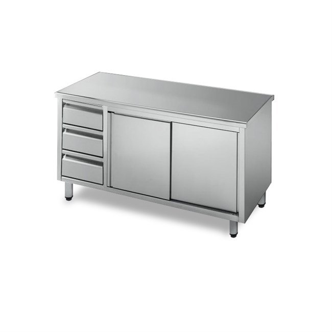Tavolo armadiato professionale realizzato in acciaio Inox altamente stabile, dotato di piedini regolabili, ante scorrevoli e cassettiera a sinistra. Il nostro ufficio tecnico è disponibile a realizzare prodotti con dimensioni e forme diversi dalla nostra gamma.