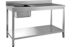 Tavolo da lavoro professionale realizzato in acciaio Inox altamente stabile, dotato di piedini regolabili, di vasca a sinistra e alzatina.Il nostro ufficio tecnico è disponibile a realizzare prodotti con dimensioni e forme diversi dalla nostra gamma.